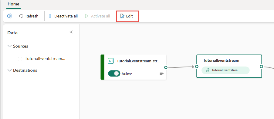 ในส่วน รายละเอียดสตรีม ให้เลือกปุ่มดินสอ เปลี่ยนชื่อของสตรีมเหตุการณ์เป็น TutorialEventstream แล้วเลือก ถัดไป