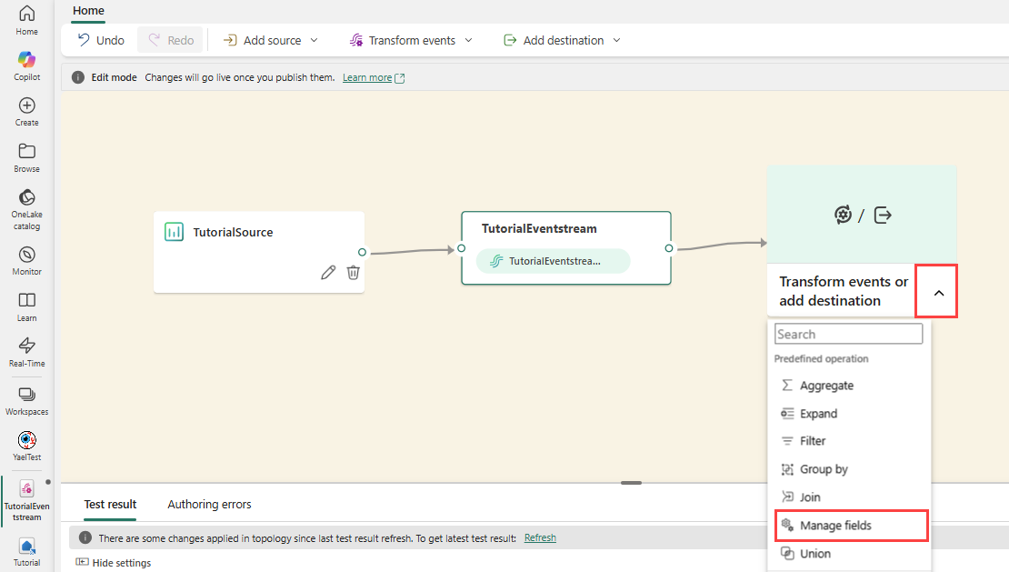 ในพื้นที่ทํางานการเขียนเหตุการณ์เลือกลูกศรลงบนการแปลงเหตุการณ์ หรือเพิ่มไทล์ปลายทาง จากนั้น เลือกจัดการเขตข้อมูล ไทล์ถูกเปลี่ยนชื่อเป็น