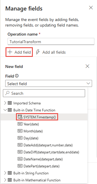 จากเมนูแบบเลื่อนลง ฟิลด์ ให้เลือก ระบบฟังก์ชัน>วันที่และเวลาในตัว Timestamp()
