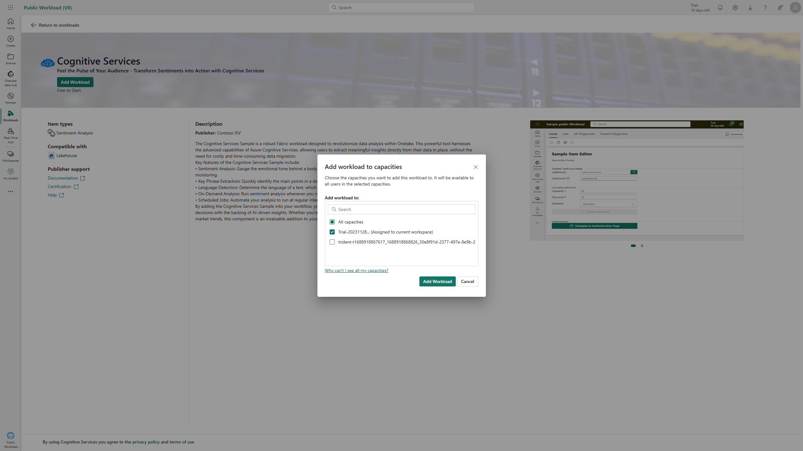 หากต้องการดูพื้นที่ทํางานทั้งหมดที่สามารถใช้ปริมาณงานได้ ให้เลือกปริมาณงาน จากนั้นเลือก ดูพื้นที่ทํางาน จากนั้นใช้กล่องโต้ตอบเพื่อไปยังพื้นที่ทํางานและสร้างรายการใหม่ Cognitive Services จะแสดงในภาพหน้าจอต่อไปนี้เป็นตัวอย่าง