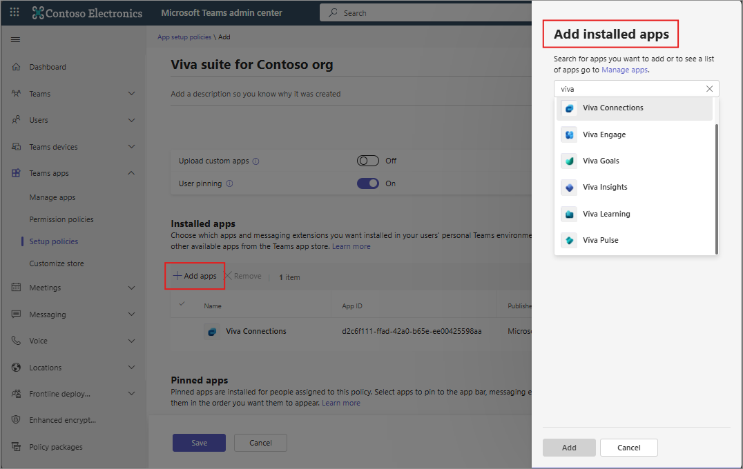 - Existing installed apps using app setup policies will remain intact. However, no new additions are permitted, and only deletions are allowed. Instead, you can install Teams apps for selected users, groups, or all users directly from the respective app. Other settings in app setup policies, including Pinned apps, will remain unchanged.