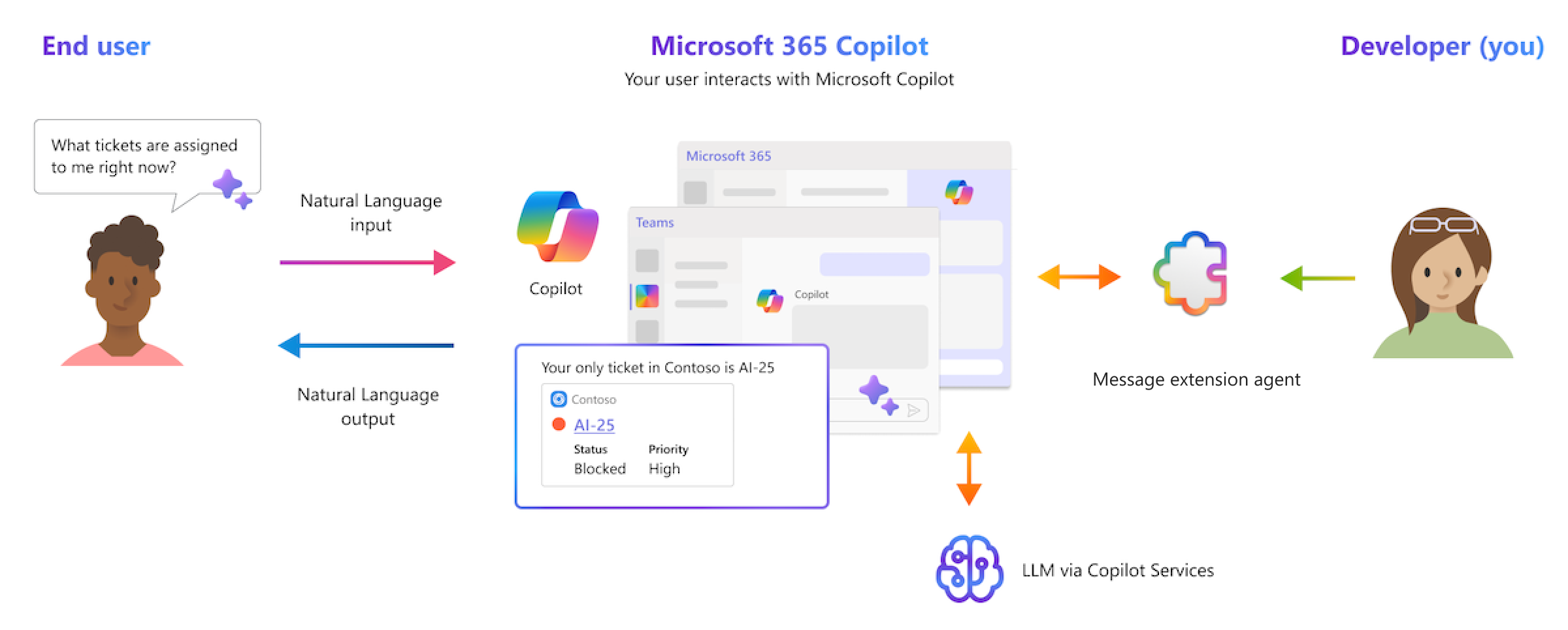 Microsoft 365 Copilot, powered by an advanced processing and orchestration engine, integrates Microsoft 365 apps, Microsoft Graph, and Large Language Models (LLMs) to transform your words into a potent productivity tool. Although Microsoft 365 Copilot can utilize apps and data within the Microsoft 365 ecosystem, many users rely on various external tools and services for work management and collaboration. By extending your message extension as an agent in Microsoft 365 Copilot, you can enable users to interact with third-party tools and services, therefore empowering them to achieve more with Microsoft 365 Copilot. You can achieve this extension by developing an agent or connecting to an external data source.