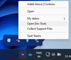On Windows: Open the desktop tray and right-click to select the Microsoft Teams icon. Select Open Dev Tools: