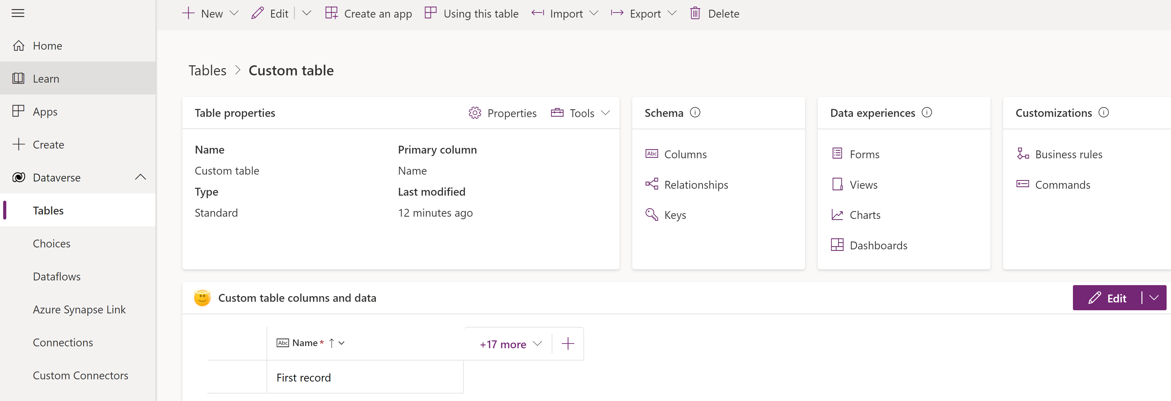 จากศูนย์รวมตาราง ให้เลือก แก้ไข เพื่อเปิดตัวออกแบบตาราง ตัวออกแบบตารางช่วยให้คุณทำการเปลี่ยนแปลงอย่างครอบคลุมในตาราง รวมถึงการแก้ไขหรือเพิ่มเรกคอร์ดและคอลัมน์ใหม่ การแก้ไขคุณสมบัติของตาราง หรือการสร้างแอปแบบจำลองที่อิงตามตาราง