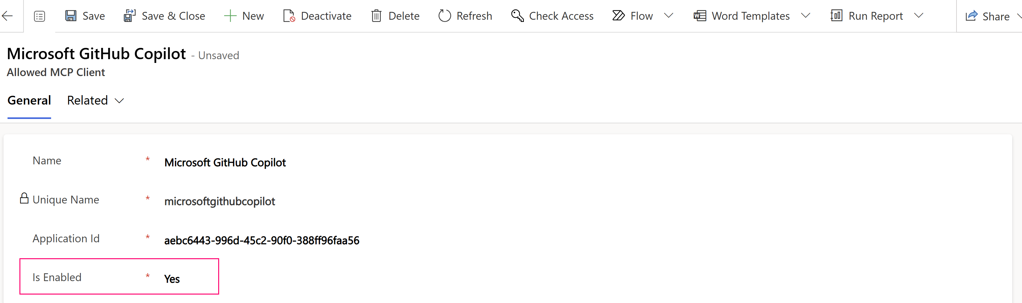 ตามค่าเริ่มต้น ไคลเอ็นต์ Allow MCP เพื่อโต้ตอบกับเซิร์ฟเวอร์ Dataverse MCP ถูกเปิดใช้งานสําหรับ Copilot Studio ผู้ดูแลระบบสามารถปิดใช้งาน MCP สําหรับ Dataverse โดยการล้างการตั้งค่า
