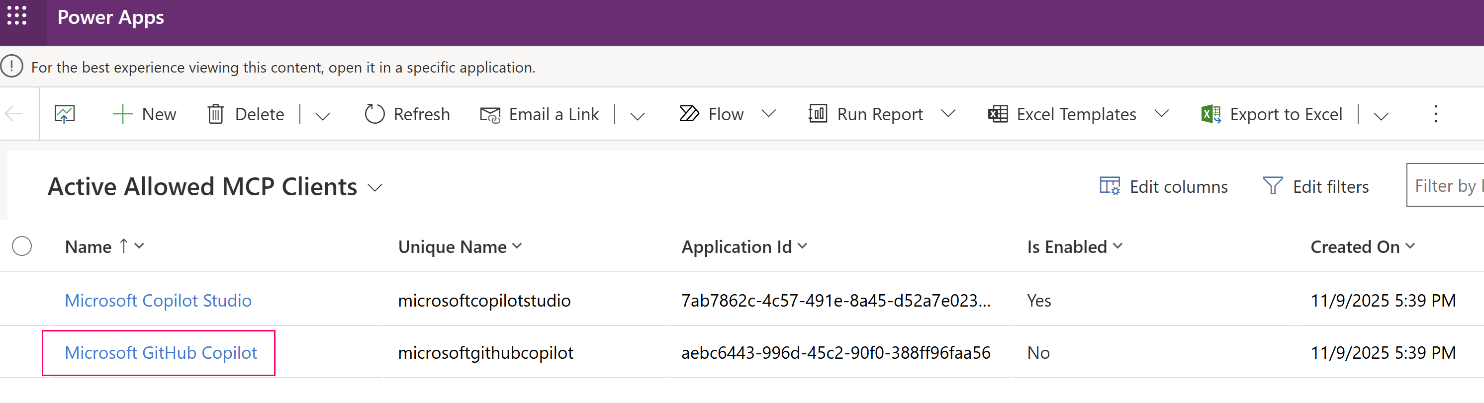 ตามค่าเริ่มต้น เซิร์ฟเวอร์ MCP Dataverse จะเปิดใช้งานสําหรับ Copilot Studio เมื่อต้องการเปิดใช้งานไคลเอ็นต์ที่ไม่ใช่ Microsoft MCP เช่น Visual Studio GitHub Copilot และ Claude ให้ทําตามขั้นตอนเหล่านี้: