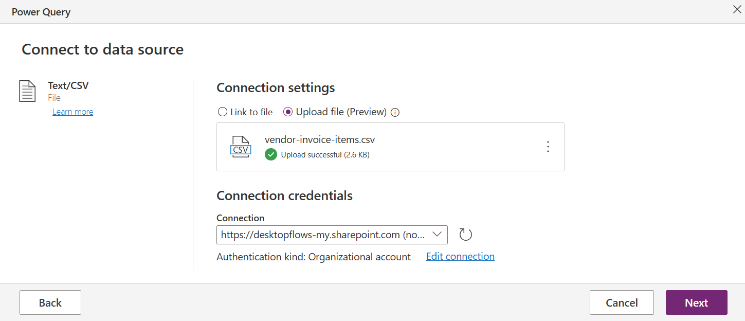 - จากนั้น เลือก อัปโหลดไฟล์ (พรีวิว) จากนั้นเลือก เรียกดู... สำหรับไฟล์ vendor-invoice-items.csv