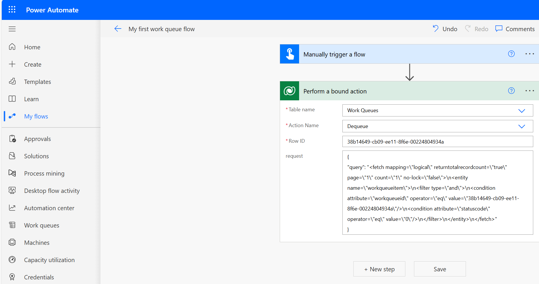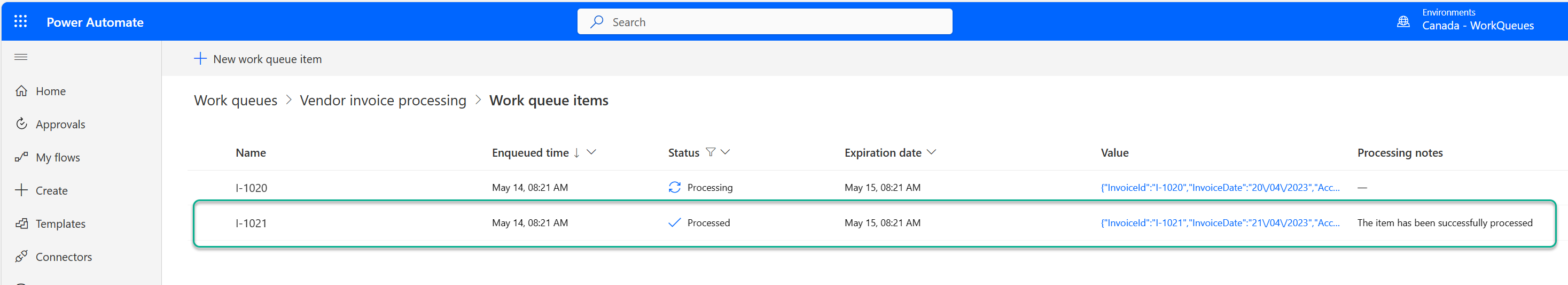 { "InvoiceId": "I-1006", "InvoiceDate": "06/04/2023", "AccountName": "Fabrikam", "ContactEmail": "invoicing@fabrikam.com", "Amount": 1253.78, "Status": "Paid", "WorkQueueKey": "Vendor Invoices", "ComponentState": 0, "OverwriteTime": "1900-01-01T00:00:00" }ตอนนี้ บันทึก โฟลว์
