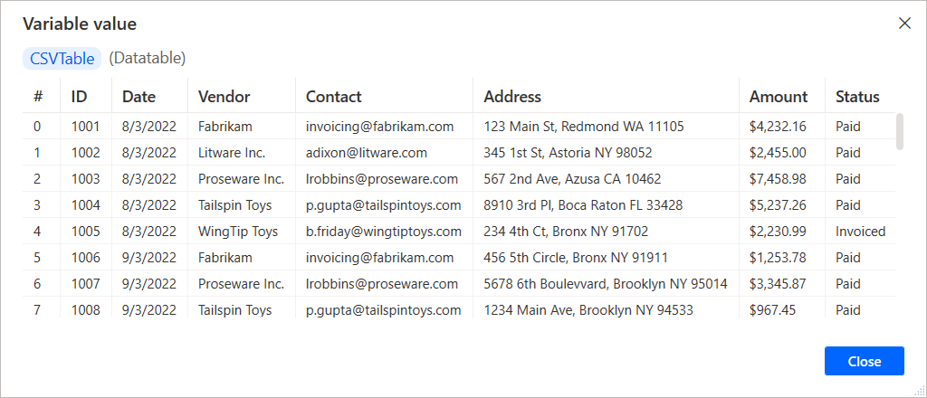 การดำเนินการสองสามอย่างแรกในกระบวนการตัวอย่างนี้จะแมปโฟลเดอร์ที่วางไฟล์ Contoso Invoices.csv รายวัน เมื่อกระบวนการทำงาน จะเริ่มต้นด้วยการอ่านตารางข้อมูลจากไฟล์ CSV ตัวแปร CSVTable มีข้อมูลที่ถูกนำเข้าและจะถูกประมวลผลไปยังรายการคิวใหม่