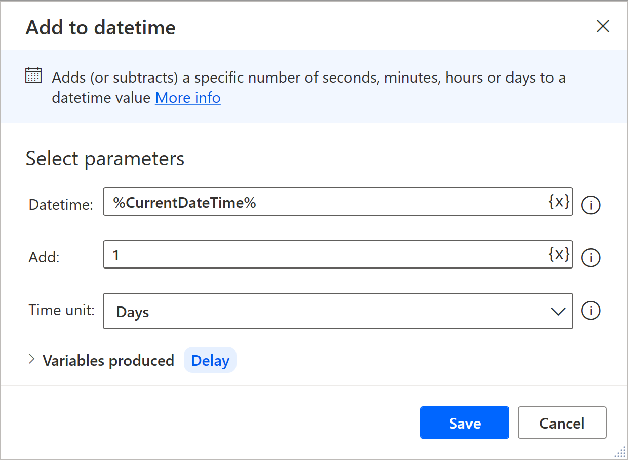 การดำเนินการสามรายการแรกของกระบวนการตัวอย่างนี้คือการดำเนินการวันที่และเวลา การดำเนินการ 'รับวันที่และเวลาปัจจุบัน' จะบันทึกวันที่และเวลาของระบบในขณะที่การดำเนินการทำงาน ต่อไป เราใช้การดำเนินการ 'เพิ่มไปยังวันที่เวลา' เพื่อให้ครอบคลุมข้อกำหนดสองประการ ขั้นแรกเราต้องกำหนดเวลาล่าช้าโดยการเพิ่ม 24 ชั่วโมงไปยังวันที่เวลาปัจจุบัน จากนั้นเราจะต้องเพิ่มเวลา 48 ชั่วโมงให้กับวันที่เวลาปัจจุบันเป็นการหมดอายุ