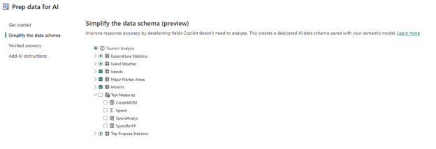 หลังจากที่คุณปิดกล่องโต้ตอบ การเปลี่ยนแปลงของคุณจะถูกบันทึกลงในแบบจําลองของคุณ Copilot ตอนนี้ใช้สคีมาข้อมูล AI ของคุณเมื่อตอบคําถามจากผู้ใช้
