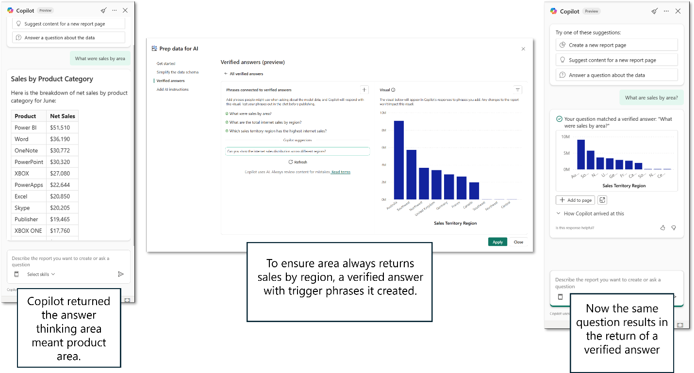 ตัวอย่างเช่น ผู้บริโภคของรายงานและแบบจําลองมักจะถามคําถามเกี่ยวกับ "ผลิตภัณฑ์ใดมียอดขายสูงสุดในสัปดาห์ที่แล้ว" เกี่ยวกับยอดขายรวมและจํานวน การตั้งค่าคําตอบที่ผ่านการตรวจสอบช่วยให้ Copilot เข้าใจตําแหน่งที่จะรับข้อมูลที่ถูกต้องจากและช่วยสร้างความไว้วางใจของผู้เขียนและผู้บริโภคด้วยคําตอบที่ให้ไว้