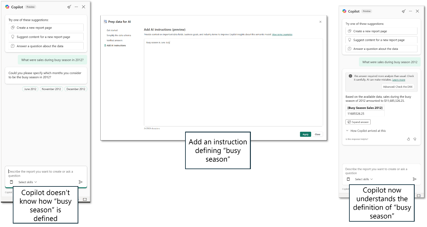 ตัวอย่างต่อไปนี้แสดงวิธีการใช้คําแนะนํา AI เพื่อให้บริบทเพิ่มเติมแก่ Copilot ผู้ใช้ขอยอดขายในช่วงไม่ว่างของปี 2012 ฤดูกาลที่ไม่ว่างเป็นวลีที่กําหนดไว้อย่างดีและมักใช้ภายในองค์กรนี้ อย่างไรก็ตาม แบบจําลองความหมายไม่มีการระบุคํานี้ที่ใดก็ได้ ผู้สร้างแบบจําลองตั้งค่าคําแนะนําที่ฤดูกาลยุ่งเหน็จถูกกําหนดเป็น เดือนมิถุนายน-ส.ค.