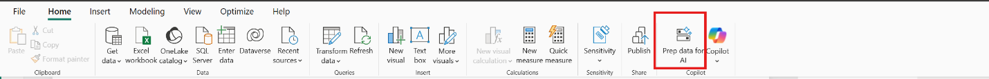 เลือกปุ่ม เตรียมข้อมูลสําหรับ AI ที่อยู่บนริบบอน หน้าแรก ใน Power BI Desktop หรือบน Ribbon บนแบบจําลองความหมายที่เลือกในบริการของ Power BI