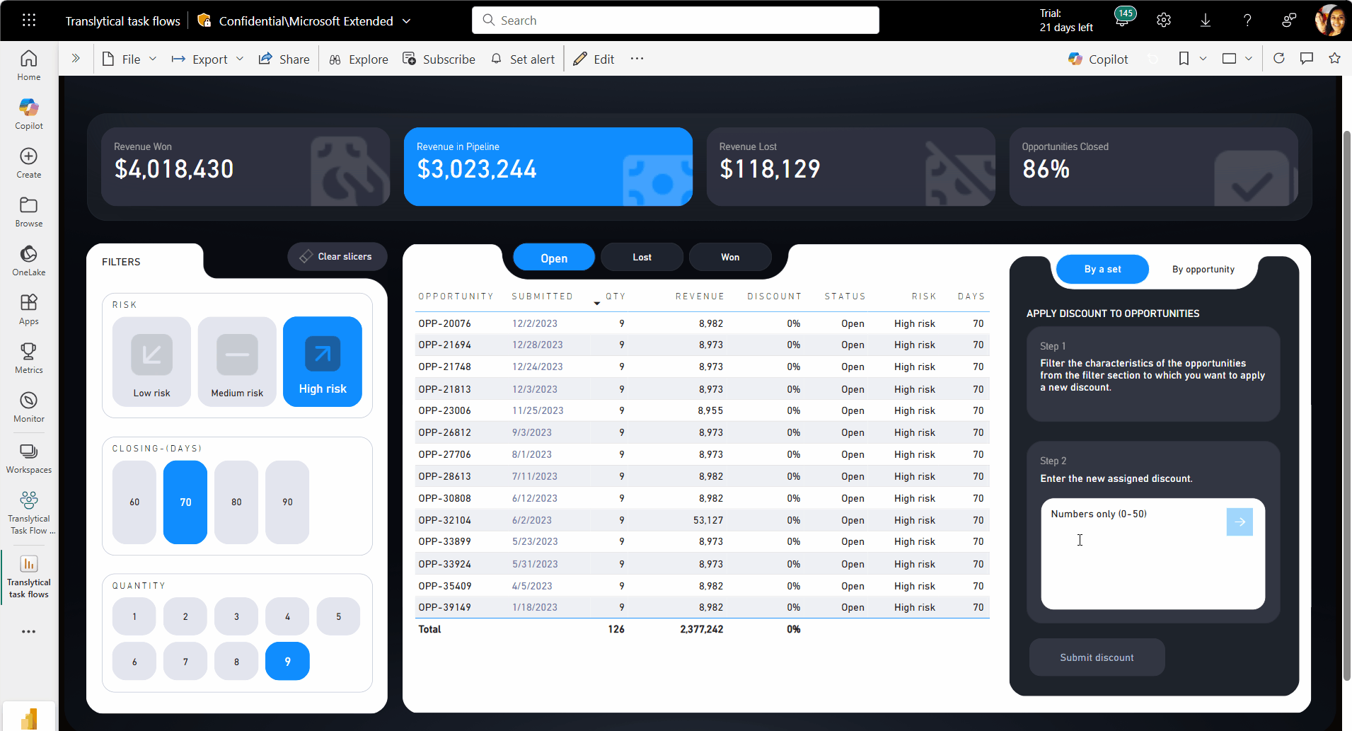 ตัวอย่างต่อไปนี้แสดงโฟลว์งาน translytical ที่เชื่อมต่อรายงาน Power BI ที่แสดงโอกาสการขายกับเวิร์กโฟลว์ที่โพสต์คําขอไปยัง Teams ในตัวอย่างนี้ คุณจะเห็นว่าผู้ใช้กรองตารางเพื่อแสดงเฉพาะโอกาสที่มีความเสี่ยงสูงที่มีปริมาณสูงกับหน้าต่างเวลาที่จํากัด ผู้ใช้ร้องขอส่วนลด 10% สําหรับโอกาสเหล่านี้และแสดงให้เห็นคําขอในเขตข้อมูลข้อคิดเห็น เมื่อพวกเขาเลือกปุ่ม ร้องขอส่วนลด การป้อนข้อมูลจากตารางและเขตข้อมูลข้อความจะถูกส่งผ่านไปยังฟังก์ชันข้อมูลผู้ใช้ ฟังก์ชันจะโพสต์ข้อความใน Teams พร้อมรายละเอียดเพื่อให้สามารถอนุมัติหรือปฏิเสธคําขอได้
