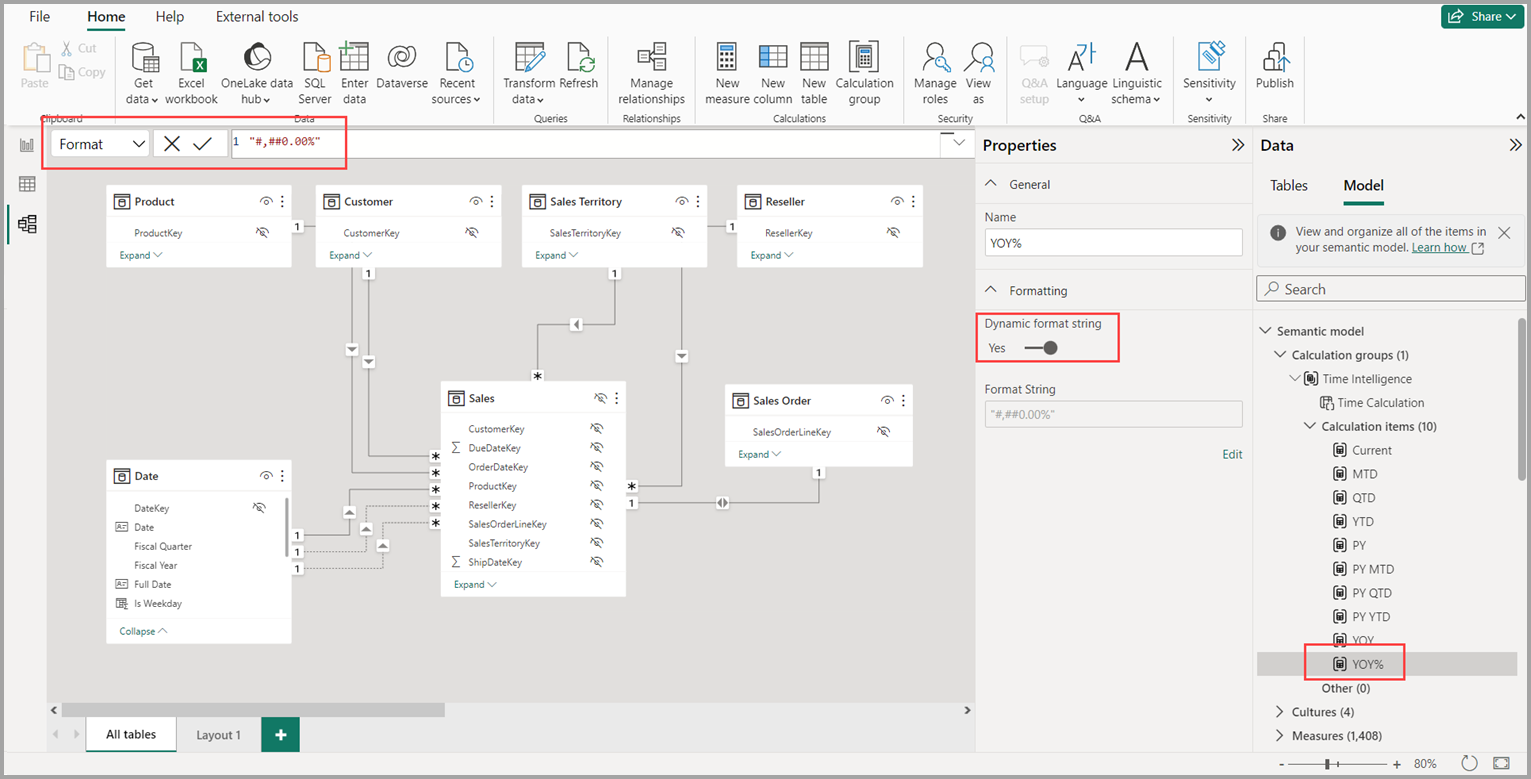 รายการการคํานวณใช้การจัดรูปแบบหน่วยวัดพื้นฐานตามค่าเริ่มต้น เราอาจต้องการแสดง YOY เป็น เปอร์เซ็นต์แทน เมื่อต้องการทําเช่นนั้น ให้เลือก รายการการคํานวณ YOY% จากนั้นเปิดใช้งาน สตริง รูปแบบแบบไดนามิกในบานหน้าต่างคุณสมบัติซึ่งช่วยให้คุณสามารถระบุนิพจน์ DAX เพื่อสร้างสตริงรูปแบบได้ สําหรับตัวอย่างนี้ ไม่จําเป็นต้องมีองค์ประกอบตามเงื่อนไขใดๆ ดังนั้นเพียงแค่ #,##0.00% เปลี่ยนรูปแบบเป็นเปอร์เซ็นต์เมื่อใช้รายการการคํานวณนี้ ดังที่แสดงในรูปต่อไปนี้