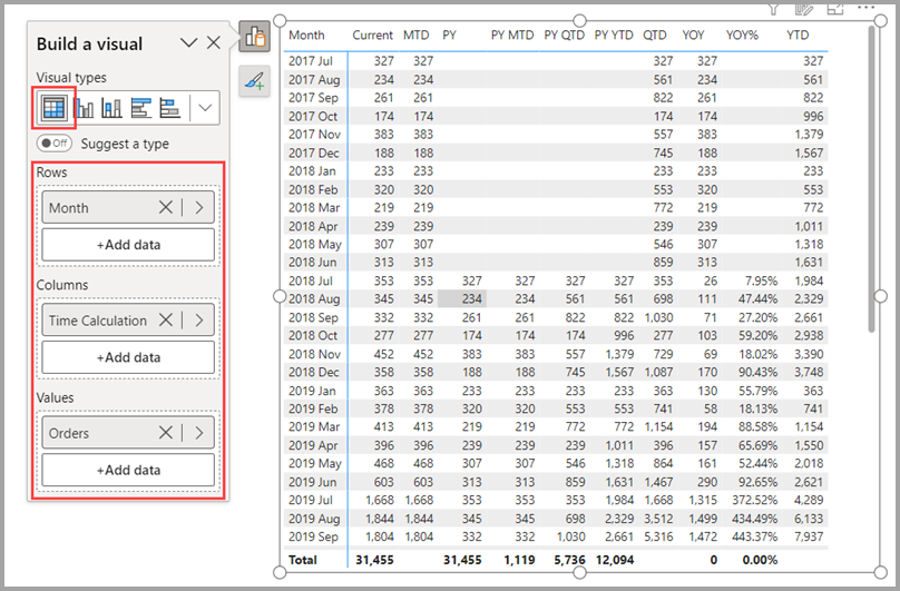 หากต้องการใช้กลุ่มการคํานวณใหม่ของคุณในรายงาน ให้ไปที่ มุมมองรายงาน สร้าง วิชวลเมทริกซ์ และเพิ่มรายการต่อไปนี้: