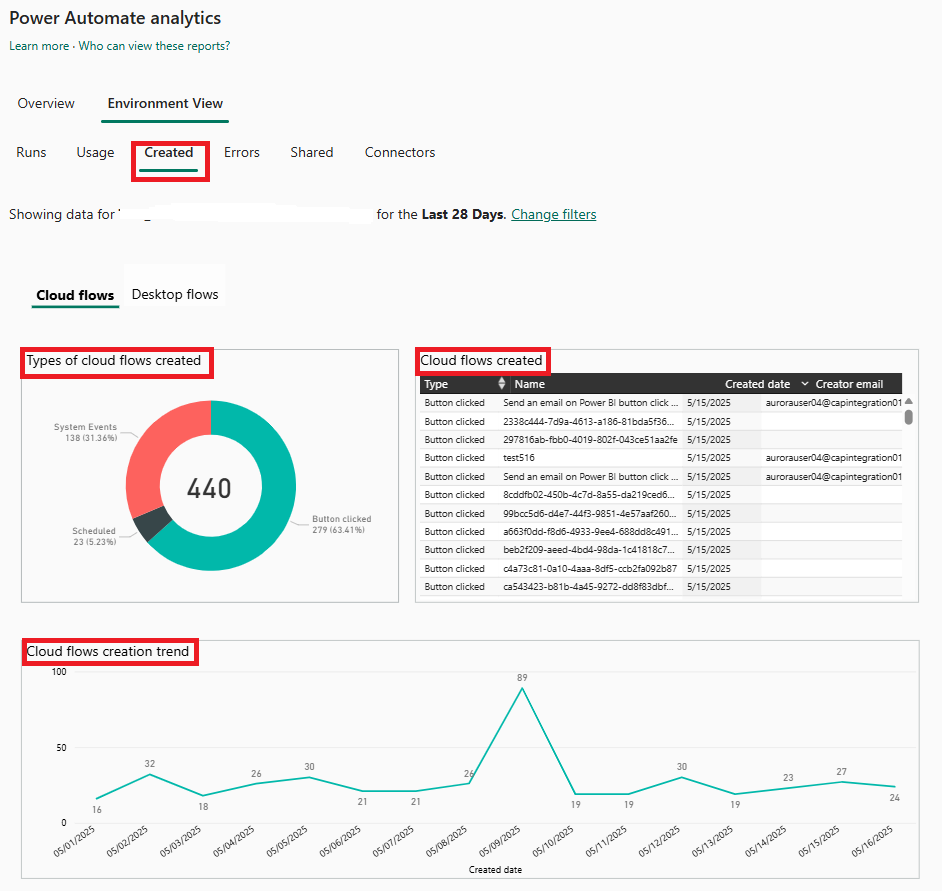 ผู้ดูแลระบบสภาพแวดล้อมสามารถเข้าถึงการวิเคราะห์สำหรับ Power Automate ใน Microsoft ศูนย์การจัดการ Power Platform รายงานจะให้ข้อมูลเชิงลึกเกี่ยวกับการเรียกใช้ การใช้งาน ข้อผิดพลาด ชนิดของโฟลว์ที่สร้างขึ้น เช่น โฟลว์อัตโนมัติ ปุ่ม กำหนดเวลา การอนุมัติ และโฟลว์กระบวนการธุรกิจ นอกจากนี้ยังมีรายละเอียดเกี่ยวกับโฟลว์ที่ใช้ร่วมกันและตัวเชื่อมต่อที่เกี่ยวข้องกับโฟลว์แต่ละประเภท อย่างไรก็ตาม รายงานเหล่านี้ไม่มีข้อมูลเชิงลึกสำหรับโฟลว์เดสก์ท็อป