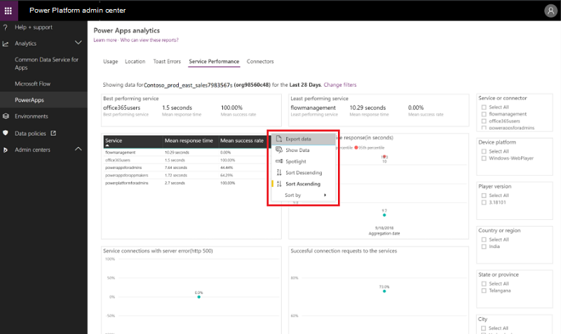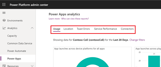 การวิเคราะห์สำหรับผู้ดูแลสภาพแวดล้อมพร้อมใช้งานที่ศูนย์จัดการ Microsoft Power Platform รายงานผู้ดูแลระบบให้มุมมองในการใช้งานระดับสภาพแวดล้อม ข้อผิดพลาด ประสิทธิภาพการบริการเพื่อผลักดันการกำกับดูแลและเปลี่ยนบริการการจัดการให้กับผู้ใช้ รายงานเหล่านี้มีให้สำหรับแอปพื้นที่ทำงานเท่านั้น และไม่สามารถใช้ได้กับแอปแบบจำลอง