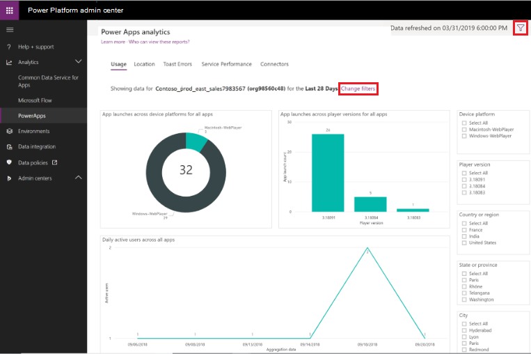 รายงานการใช้งาน เป็นรายงานเริ่มต้นที่ผู้ดูแลระบบสภาพแวดล้อมสามารถใช้ได้ ซึ่งจะให้ข้อมูลการเปิดตัวแอปทั้งหมดและจำนวนผู้ใช้ที่ใช้งานจริงรายวันสำหรับแอปทั้งหมดในสภาพแวดล้อม ในฐานะผู้ดูแลระบบ คุณสามารถกรองมุมมองด้วยแอตทริบิวต์ เช่น แพลตฟอร์มอุปกรณ์ เวอร์ชันเครื่องเล่น ประเทศ/ภูมิภาค รัฐ และเมือง