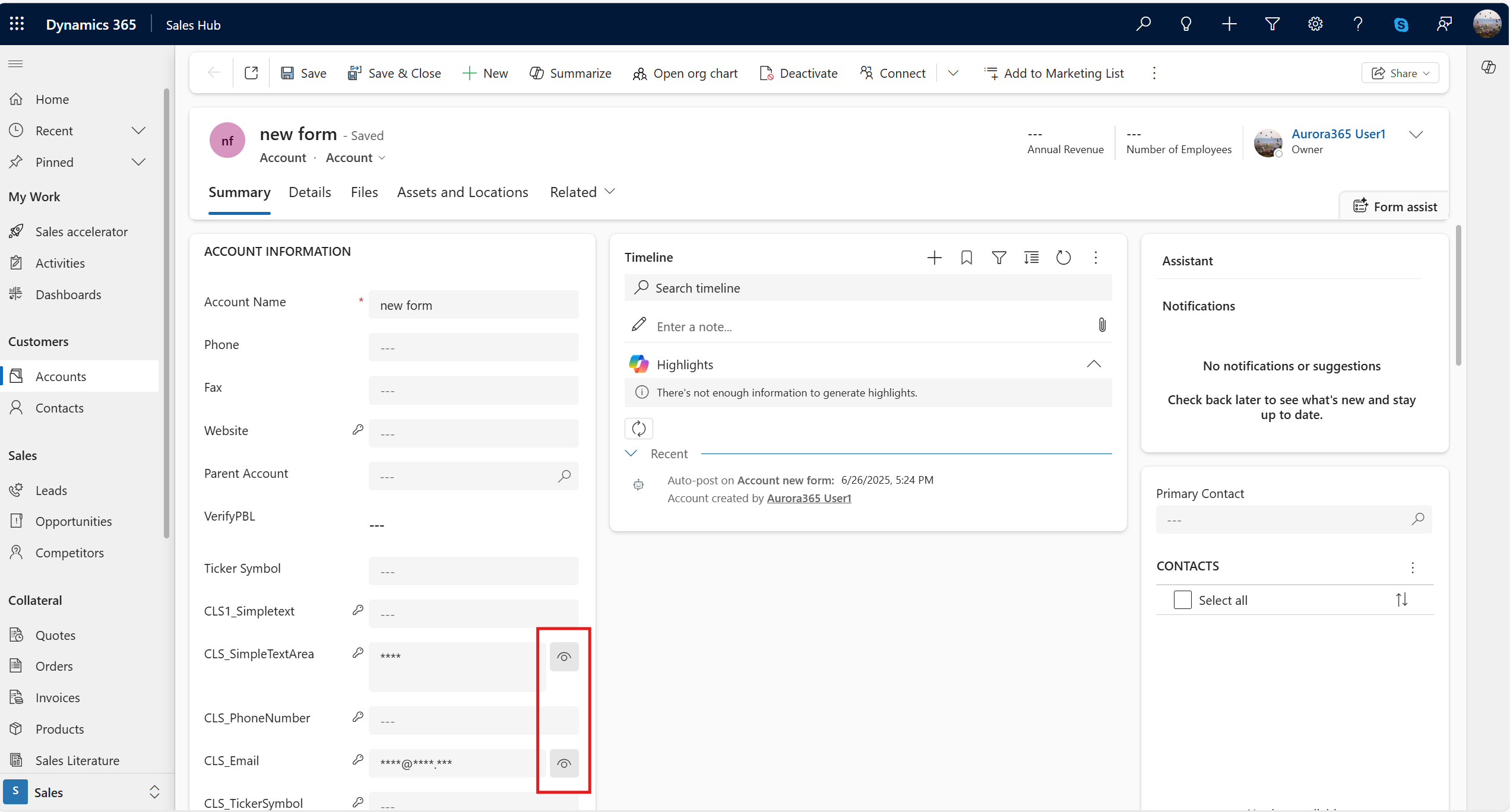 เมื่อคุณสร้างเรกคอร์ดใหม่ คุณจะต้องป้อนฟิลด์ที่ละเอียดอ่อนเป็นค่าที่ไม่ได้มาส์ก หลังจากที่คุณบันทึก แบบฟอร์มจะรีเฟรชโดยอัตโนมัติ และฟิลด์ที่ละเอียดอ่อนจะถูกปิดบังทันที