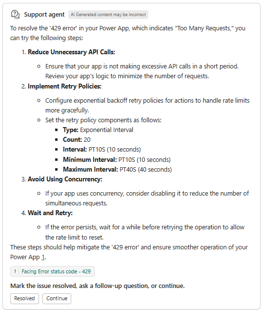 เจ้าหน้าที่ฝ่ายสนับสนุนจะให้โซลูชันโดยยึดตามการสรุปคําอธิบายและการสัมภาษณ์ของคุณ เจ้าหน้าที่จะตรวจสอบการแจ้งเตือนสถานภาพบริการสําหรับผลิตภัณฑ์ที่คุณเลือก ค้นหาผ่านปัญหาที่ทราบแล้ว สร้างคําตอบจากเอกสารและเนื้อหาชุมชน และอาจทริกเกอร์กล่องโต้ตอบการแก้ไขปัญหา ตรวจสอบเนื้อหาและทำตามคำแนะนำเพื่อความก้าวหน้าในโซลูชันสิ่งสําคัญคือต้องทราบว่าเนื้อหาที่สร้างขึ้นโดย AI อาจไม่ถูกต้อง