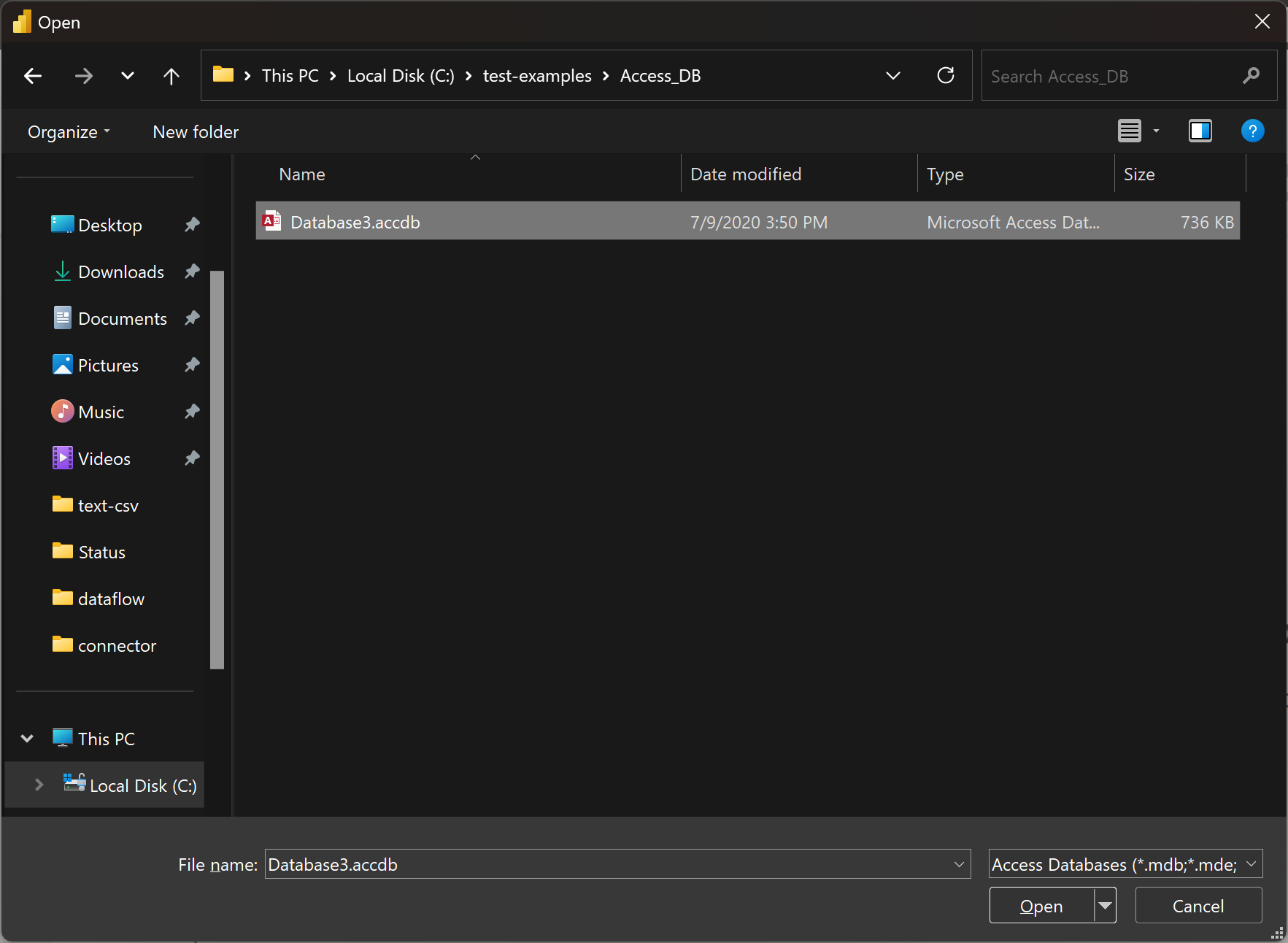 เลือกตัวเลือก ฐานข้อมูล Access ในการเลือกตัวเชื่อมต่อ