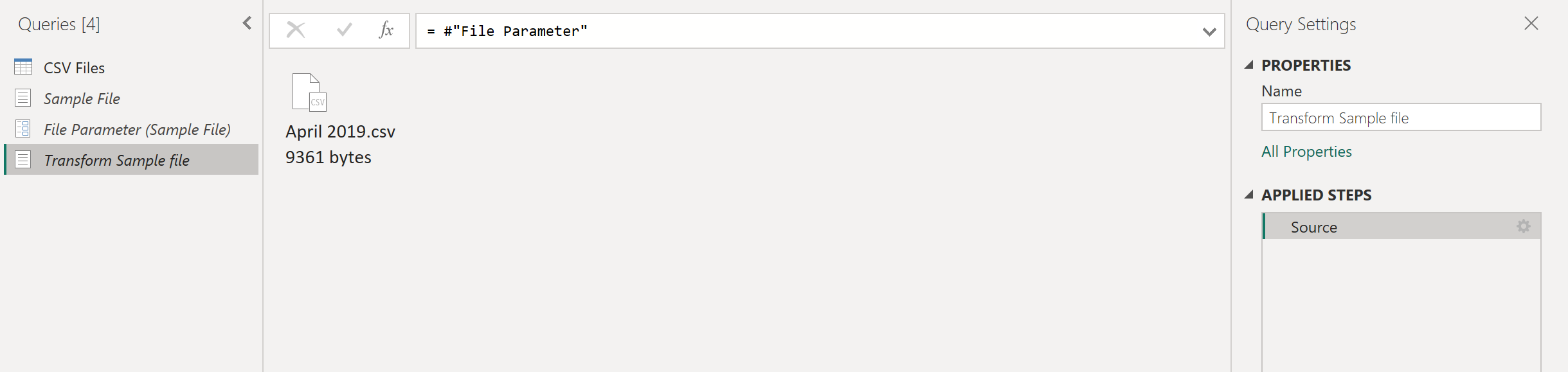 เมื่อสร้างฟังก์ชันใหม่ของคุณแล้ว ให้เลือกคิวรีที่มีชื่อ ไฟล์ตัวอย่างการแปลง คิวรีนี้จะถูกเชื่อมโยงกับ แปลงไฟล์ ฟังก์ชัน ดังนั้นการเปลี่ยนแปลงใดๆ ที่เกิดขึ้นกับคิวรีนี้จะปรากฏในฟังก์ชัน การเชื่อมต่อนี้เรียกว่าแนวคิดของคิวรีตัวอย่างที่เชื่อมโยงไปยังฟังก์ชัน