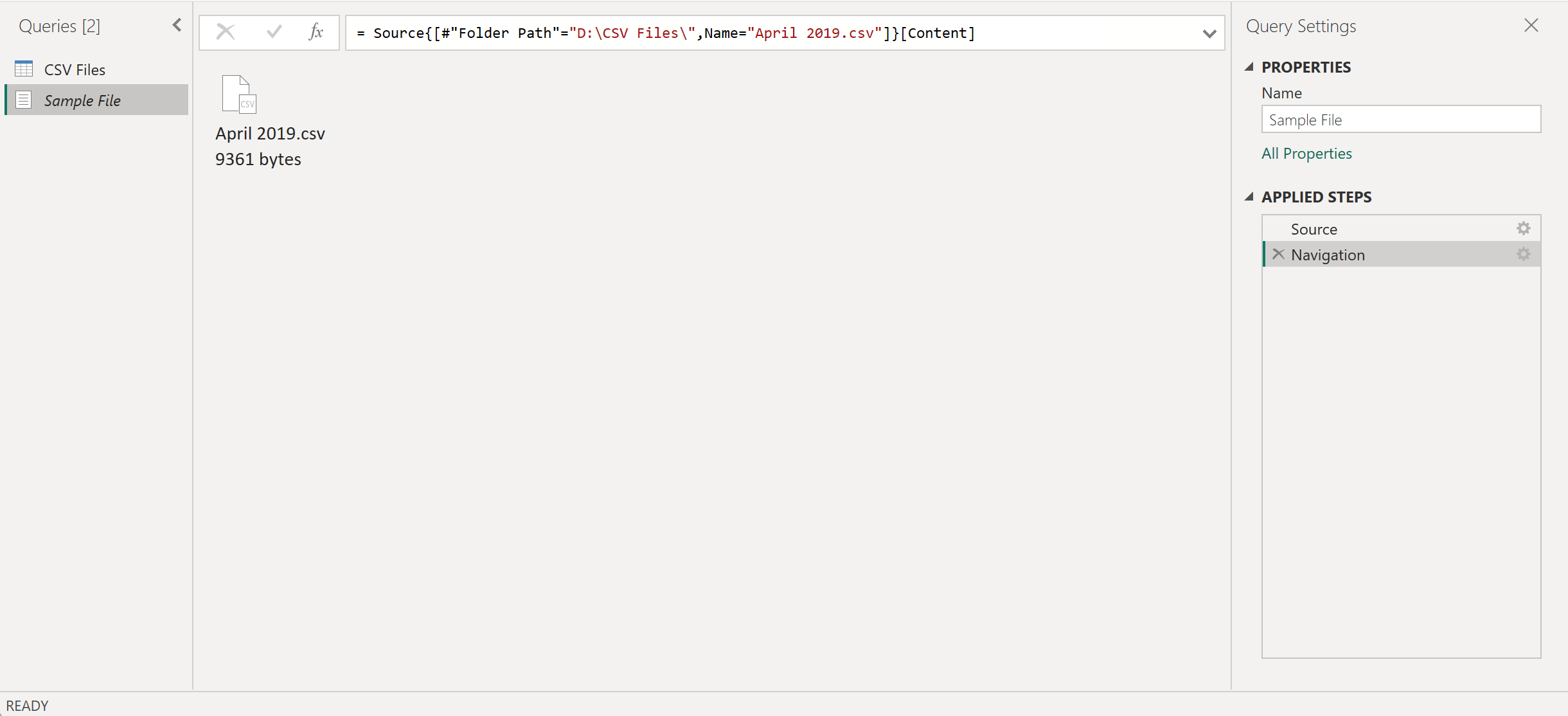 ตัวเลือกนี้จะสร้างคิวรีใหม่ที่มีขั้นตอนการนําทางไปยังไฟล์นั้นโดยตรงเป็นไบนารีและชื่อของคิวรีใหม่นี้คือเส้นทางไฟล์ของไฟล์ที่เลือก เปลี่ยนชื่อคิวรีนี้เพื่อให้ ไฟล์ตัวอย่าง