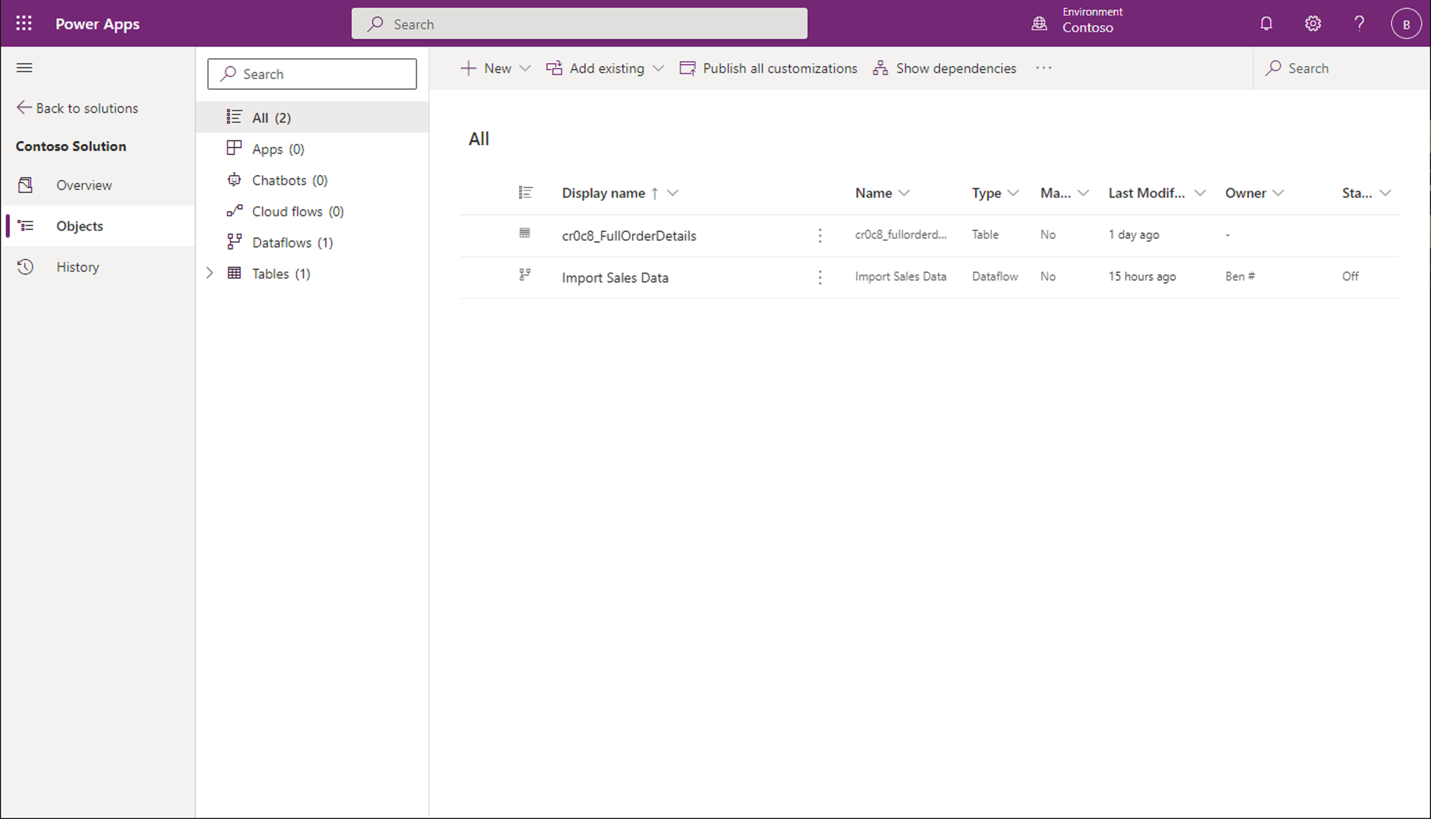 เมื่อเพิ่มทั้งกระแสข้อมูลและตารางจะโหลดข้อมูลไปยังโซลูชันแล้ว จะมีอาร์ติแฟกตสองรายการที่เพิ่มลงในโซลูชัน ในกรณีนี้ สิ่งประดิษฐ์จะถูก cr0c8_FullOrderDetails และ นําเข้าข้อมูลยอดขาย
