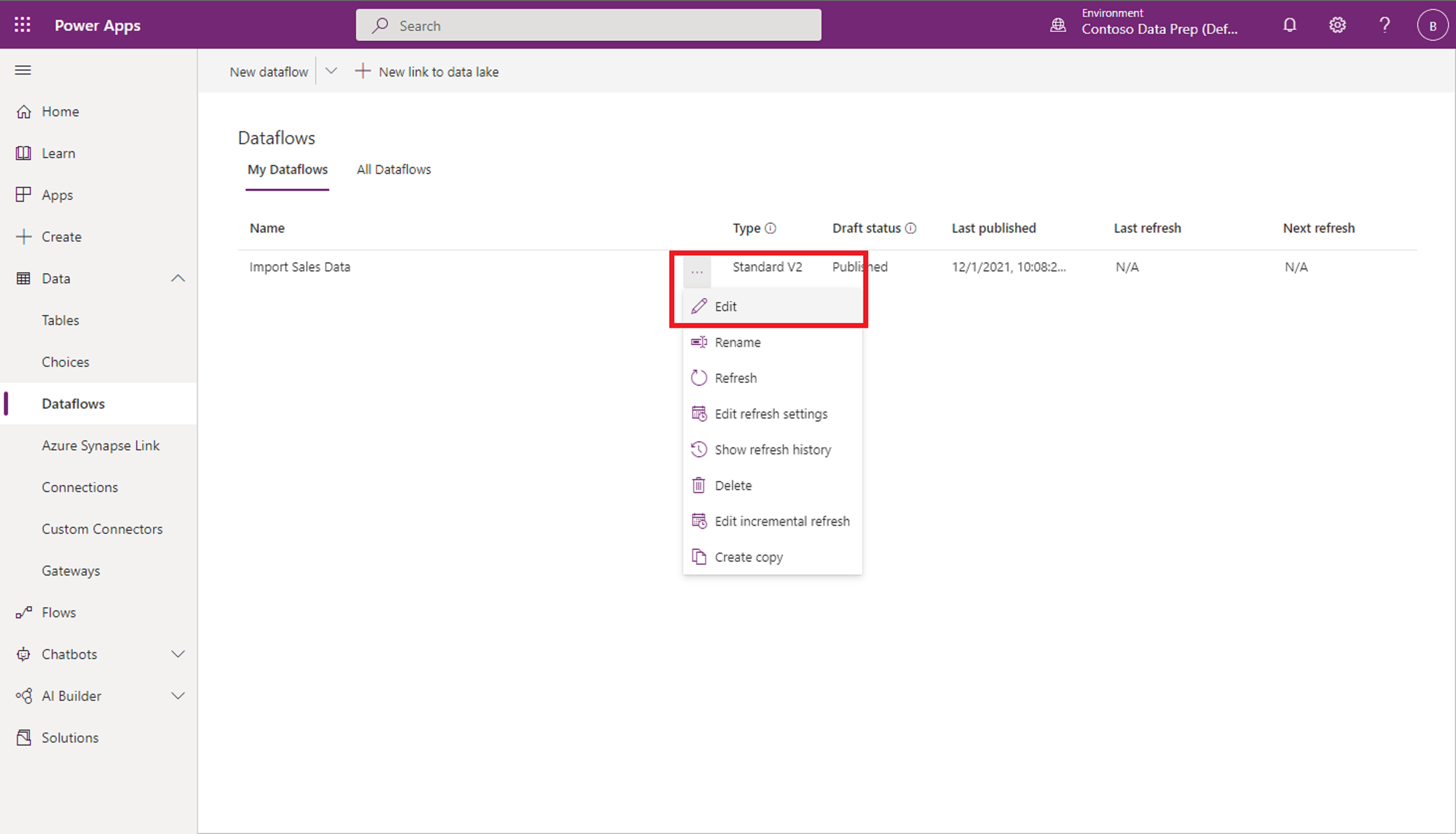 ในบานหน้าต่างนําทางด้านซ้าย เลือกลูกศรลงถัดจาก Dataverse และเลือก กระแสข้อมูล ระบุกระแสข้อมูลที่นําเข้า และเลือก แก้ไข จากเมนูบริบท