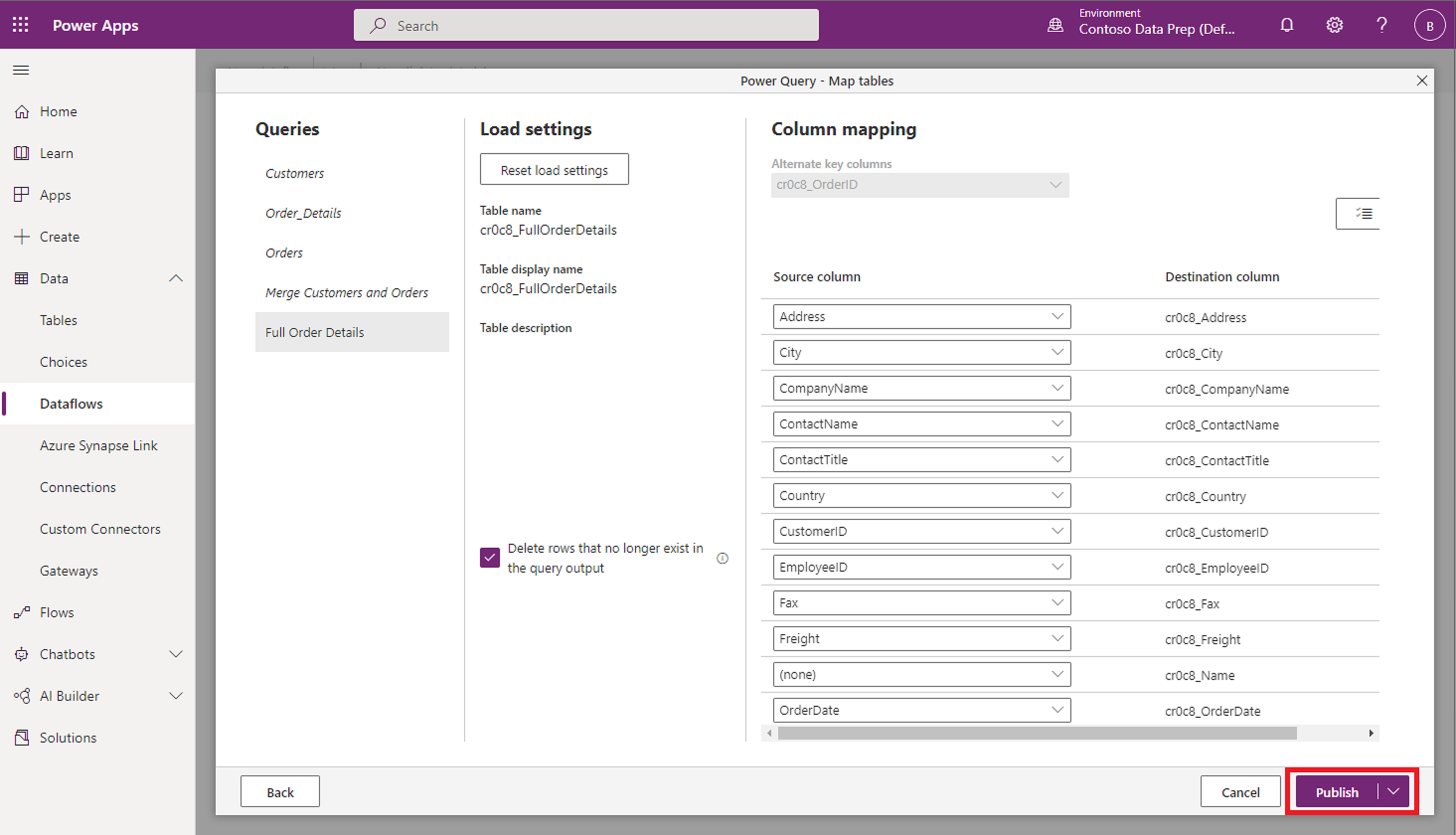 ในตัวอย่างนี้ กระแสข้อมูลที่คุณเพิ่มลงในโซลูชันจะโหลดข้อมูลลงในตารางแบบกําหนดเองที่เรียกว่า รายละเอียดคําสั่งซื้อแบบเต็มซึ่งคุณต้องการรวมไว้ในโซลูชันด้วยกระแสข้อมูล