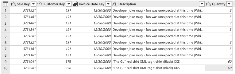 ใน เลือกคอลัมน์ ให้เลือกSale Keyคอลัมน์ , Customer Key, , Invoice Date Keyและ DescriptionQuantity คอลัมน์ แล้วเลือก ตกลง