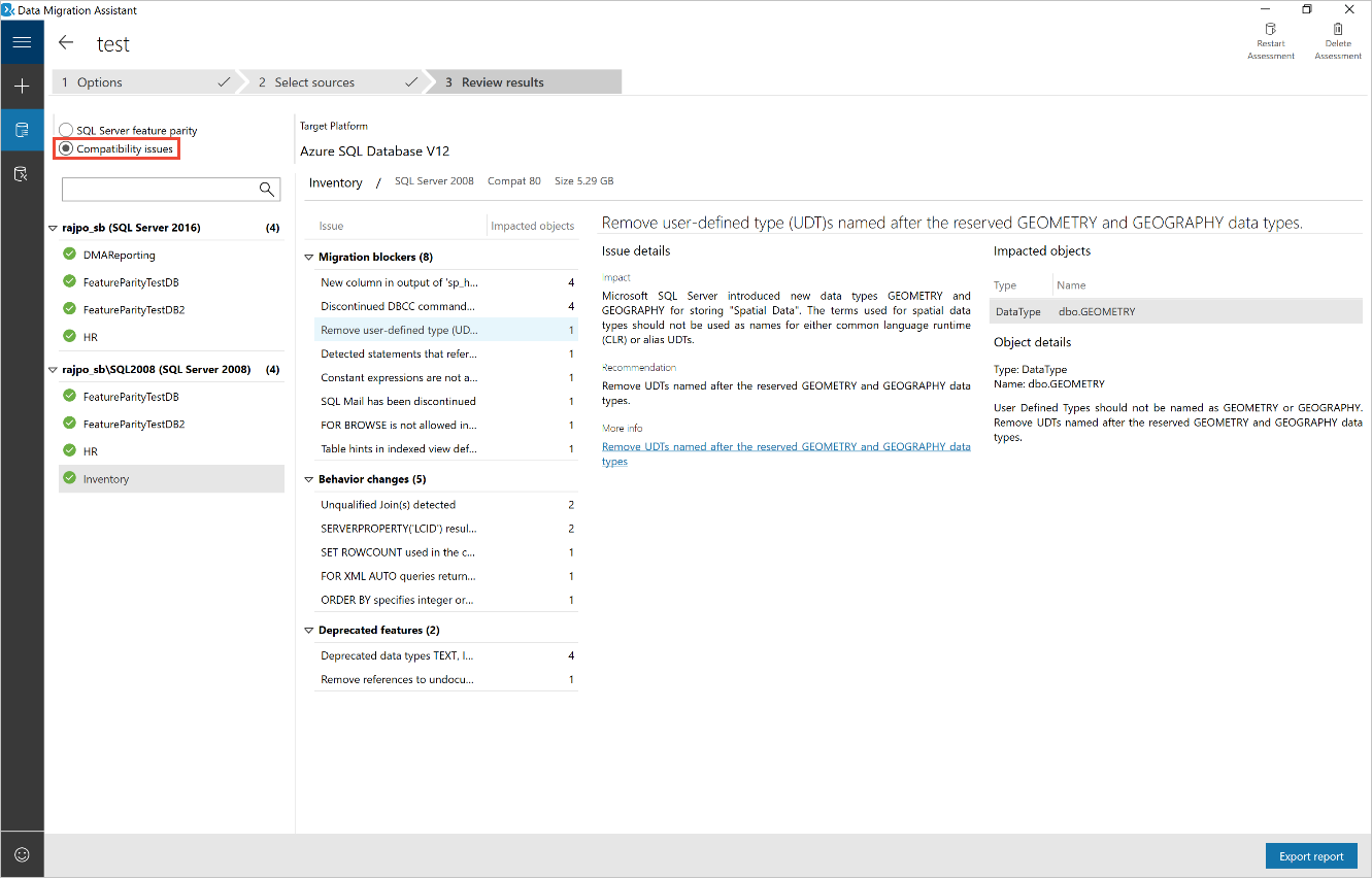 The Compatibility issues category provides partially supported or unsupported features that block migrating on-premises SQL Server databases to Azure SQL databases. It then provides recommendations to help you address those issues.