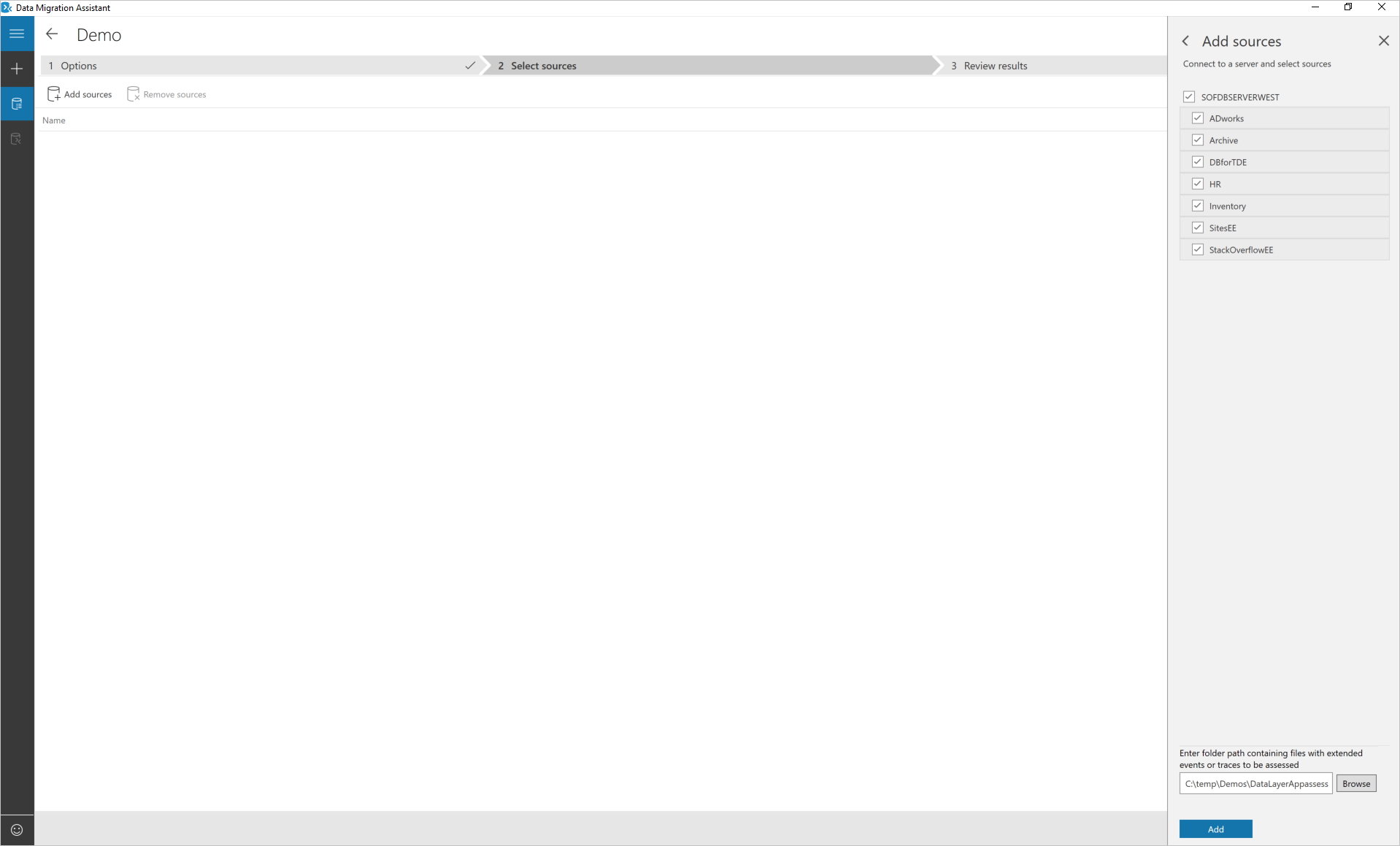 DROP EVENT SESSION [DatalayerSession] ON SERVER go CREATE EVENT SESSION [DatalayerSession] ON SERVER ADD EVENT sqlserver.sql_batch_completed( ACTION (sqlserver.sql_text,sqlserver.client_app_name,sqlserver.client_hostname,sqlserver.database_id)) ADD TARGET package0.asynchronous_file_target(SET filename=N'C:\temp\Demos\DataLayerAppassess\DatalayerSession.xel') WITH (MAX_MEMORY=2048 KB,EVENT_RETENTION_MODE=ALLOW_SINGLE_EVENT_LOSS,MAX_DISPATCH_LATENCY=3 SECONDS,MAX_EVENT_SIZE=0 KB,MEMORY_PARTITION_MODE=NONE,TRACK_CAUSALITY=OFF,STARTUP_STATE=OFF) go ---Start the session ALTER EVENT SESSION [DatalayerSession] ON SERVER STATE = START; ---Wait for few minutes ---Query events SELECT object_name, CAST(event_data as xml) as event_data, file_name, file_offset FROM sys.fn_xe_file_target_read_file('C:\temp\Demos\DataLayerAppassess\DatalayerSession*xel', 'C:\\temp\\Demos\\DataLayerAppassess\\DatalayerSession*xem', null, null) ---Stop the session after capturing the peak load. ALTER EVENT SESSION [DatalayerSession] ON SERVER STATE = STOP; goSelect Next to start the assessment.
