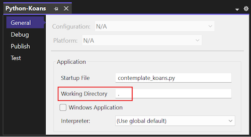 .). Notice that the Startup File has no specific folder location.The cloned program code looks for a file named koans.txt in the working directory. The code expects the directory to be the folder location where you instructed Visual Studio to store the cloned repository files. If you leave the Working Directory set to the project root (