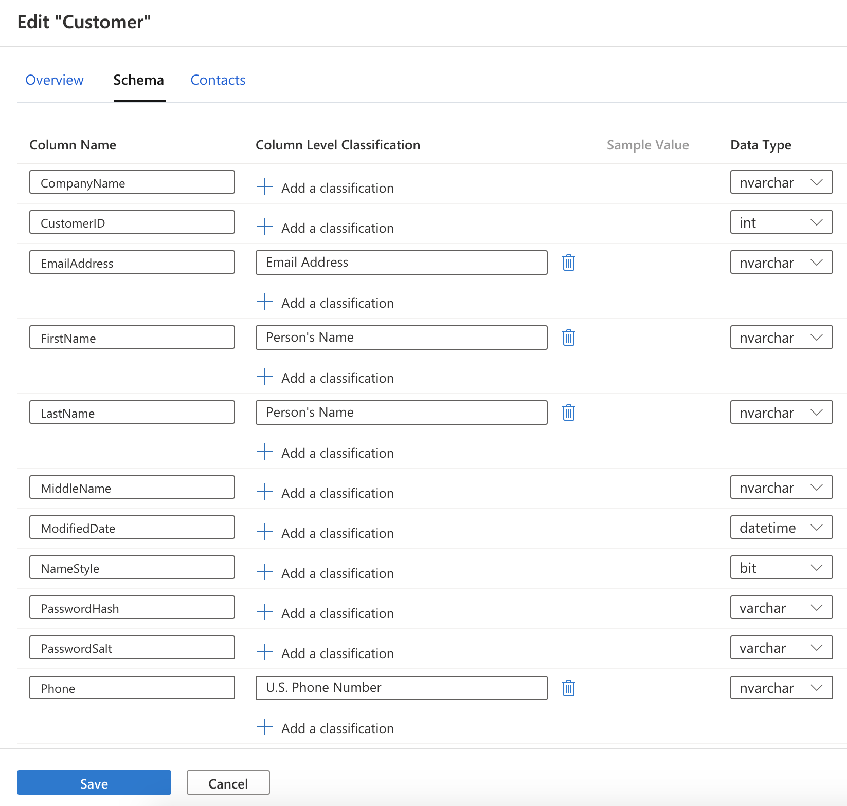 Identify the columns you're interested in and select Add a classification. This example adds a Common Passwords classification to the PasswordHash column.