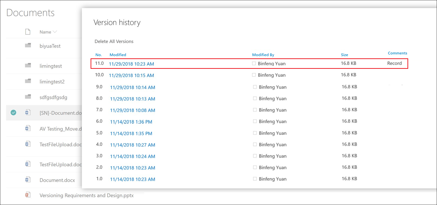 The copy created in the Records folder is added to the version history of the original document, and this version shows the word Record in the comments field.