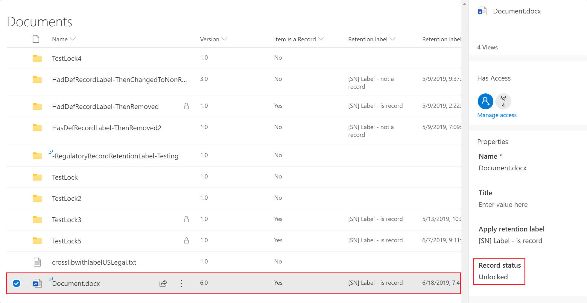 By default, record versioning is automatically available for any document that has a retention label applied that marks the item as a record, and that label is published to the site. When a user views the document properties by using the details pane, they can toggle the Record status between Locked and Unlocked. A padlock icon might also be displayed for the document, to help identify when the file is locked.