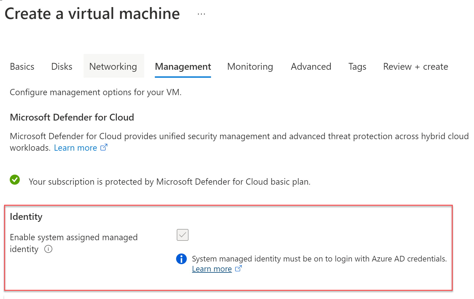 To extend your realm of control beyond the system and allow your Microsoft Entra ID tenant with Microsoft Intelligent Security Graph to support secure access, go to the Management blade of the virtual machine and turn on System Assigned Managed Identity, as shown here.