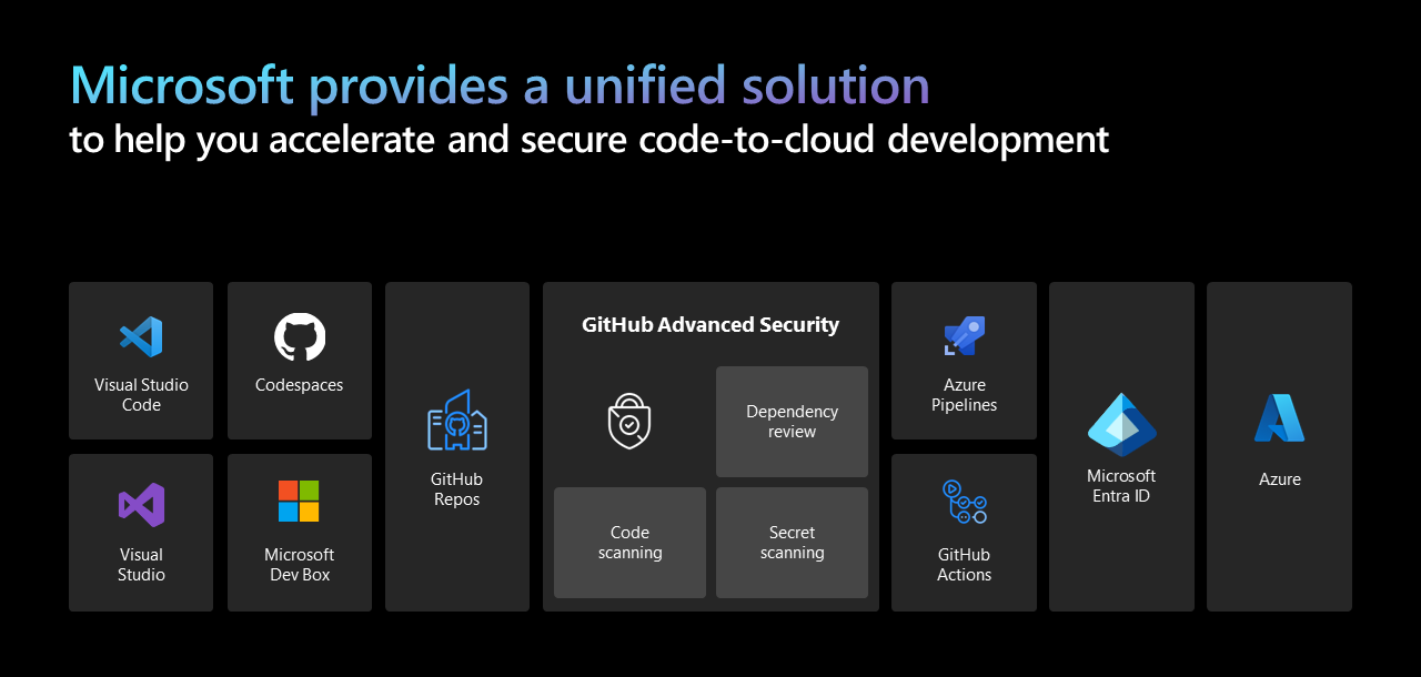 Microsoft's unified solution, illustrated in the following diagram, bridges across DevOps and SecOps teams to help you accelerate and secure code-to-cloud development.