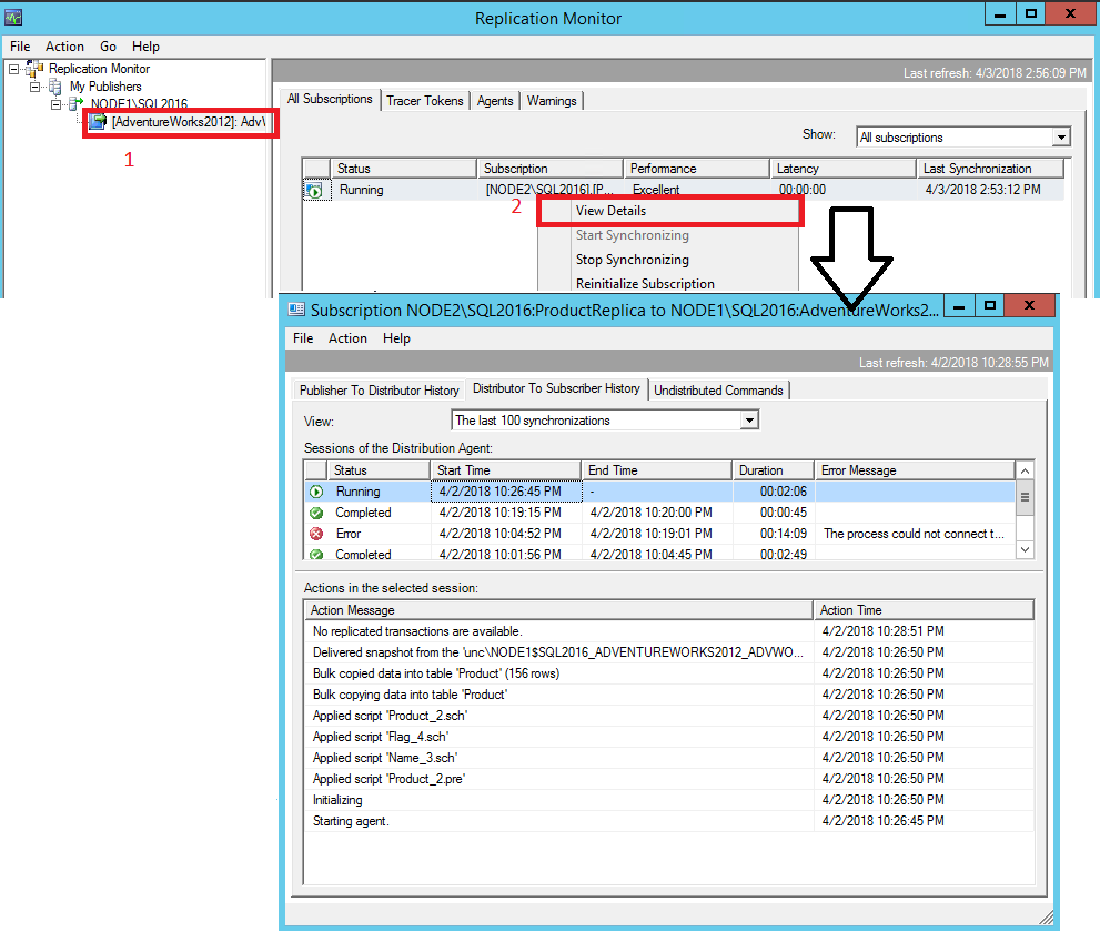 2. In Replication Monitor, select the AdvWorksProductTrans publication, and select the All Subscriptions tab. Right-click the subscription and select View Details: