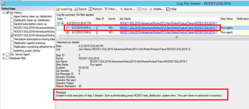 Agent 'NODE1\SQL2016-AdventureWorks2022-AdvWorksProductTrans-NODE2\SQL2016-7' is retrying after an error. 89 retries attempted. See agent job history in the Jobs folder for more details.