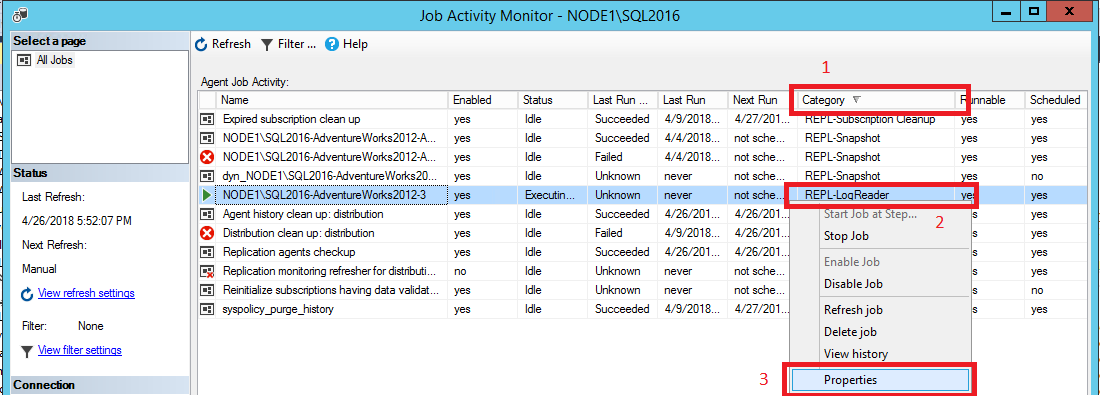 2. Sort by Category and identify the Log Reader Agent by the REPL-LogReader category.
