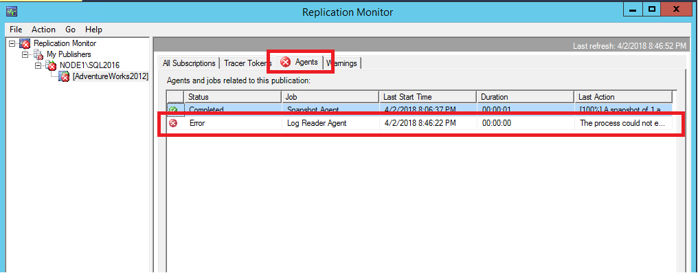 3. Select the AdvWorksProductTrans publication on the left, and then look for the red X on one of the tabs to identify where the issue is. In this case, the red X is on the Agents tab, so one of the agents is encountering an error: