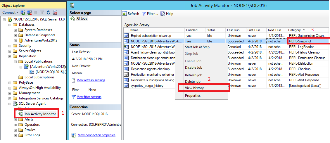 2. Right-click your publication AdvWorksProductTrans > View Snapshot Agent Status.