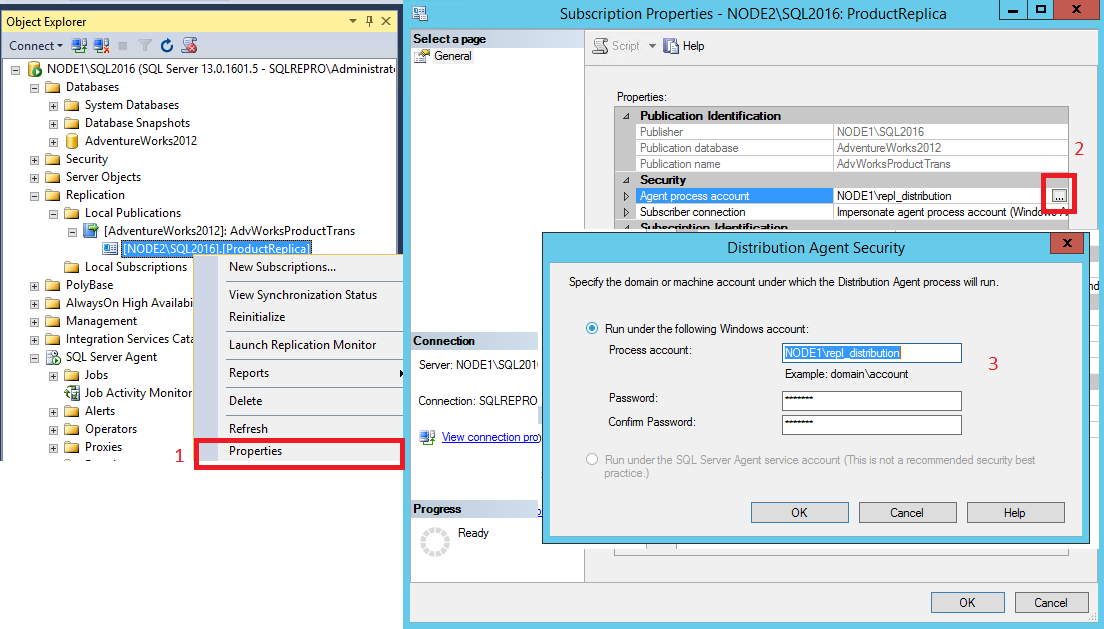 Unable to start execution of step 2 (reason: Error authenticating proxy NODE1\repl_distribution, system error: The user name or password is incorrect.)