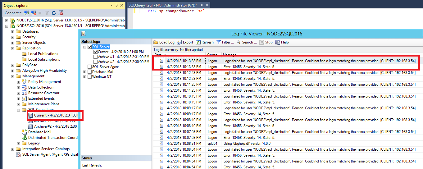 8. This error indicates that the Distribution Agent couldn't connect to the subscriber, because the login failed for user NODE2\repl_distribution. To investigate further, connect to the subscriber and open the current SQL Server error log under the Management node in Object Explorer: