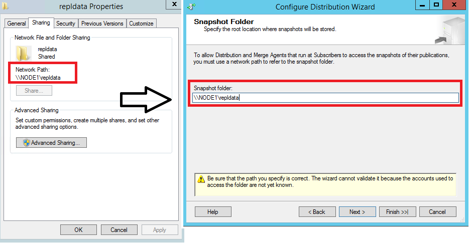 Enter the path \\<Publisher_Machine_Name>\repldata in the Snapshot folder box, and then select Next. This path should match what you saw previously under Network Path for your repldata properties folder after configuring your share properties.