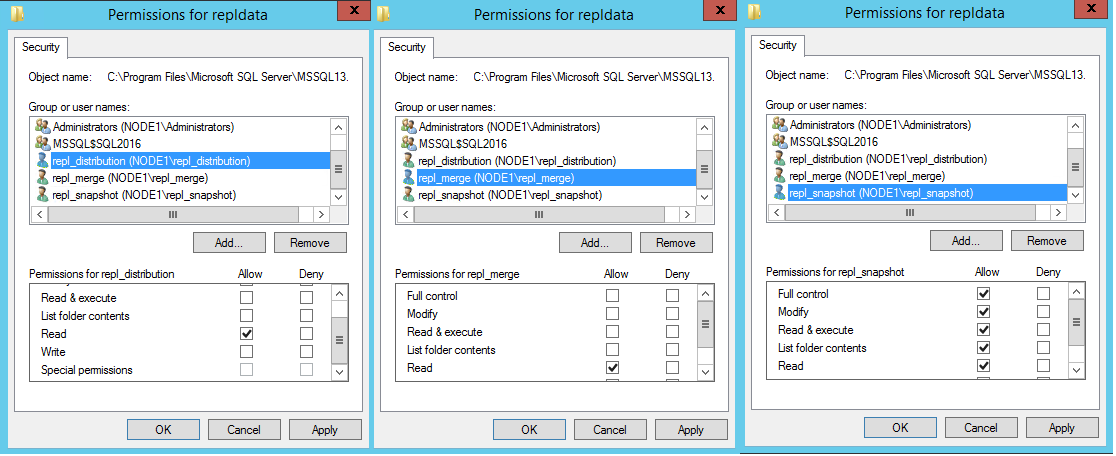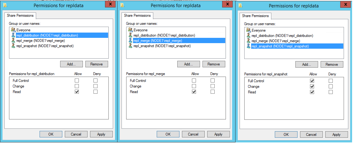 In the Permissions for repldata dialog box, select Add. In the Select User, Computers, Service Account, or Groups box, type the name of the Snapshot Agent account that you created previously, as <Publisher_Machine_Name>\repl_snapshot. Select Check Names, and then select OK.
